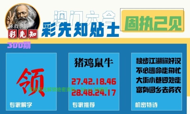 300期:彩先知贴士一字:【领】 诗句:固执已见 机密特诗:独步江湖称好汉,不必逃命走匆忙,大街小巷四处走,富有回乡去务农 解:独步江湖称好汉,解独字肖:猪狗鸡猴蛇龙,富有回乡去务农,解富肖:猪龙虎兔猴蛇 九肖:猪狗鸡猴蛇龙羊兔虎 |